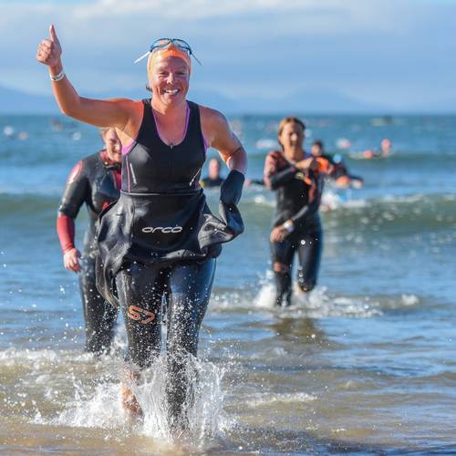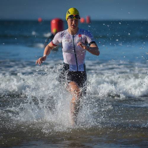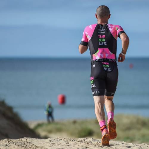 Saturday followed the weather pattern, with beautiful sunshine and calm seas providing the best possible racing conditions. Due to the moving sandbar beneath the waves, this year swim was 750m along the beach from transition adding an additional challenging section of beach run in to the mix but with a 10-minute extension added to the T1 cut off, every athlete made it safely out on to the bike in the time allowed.